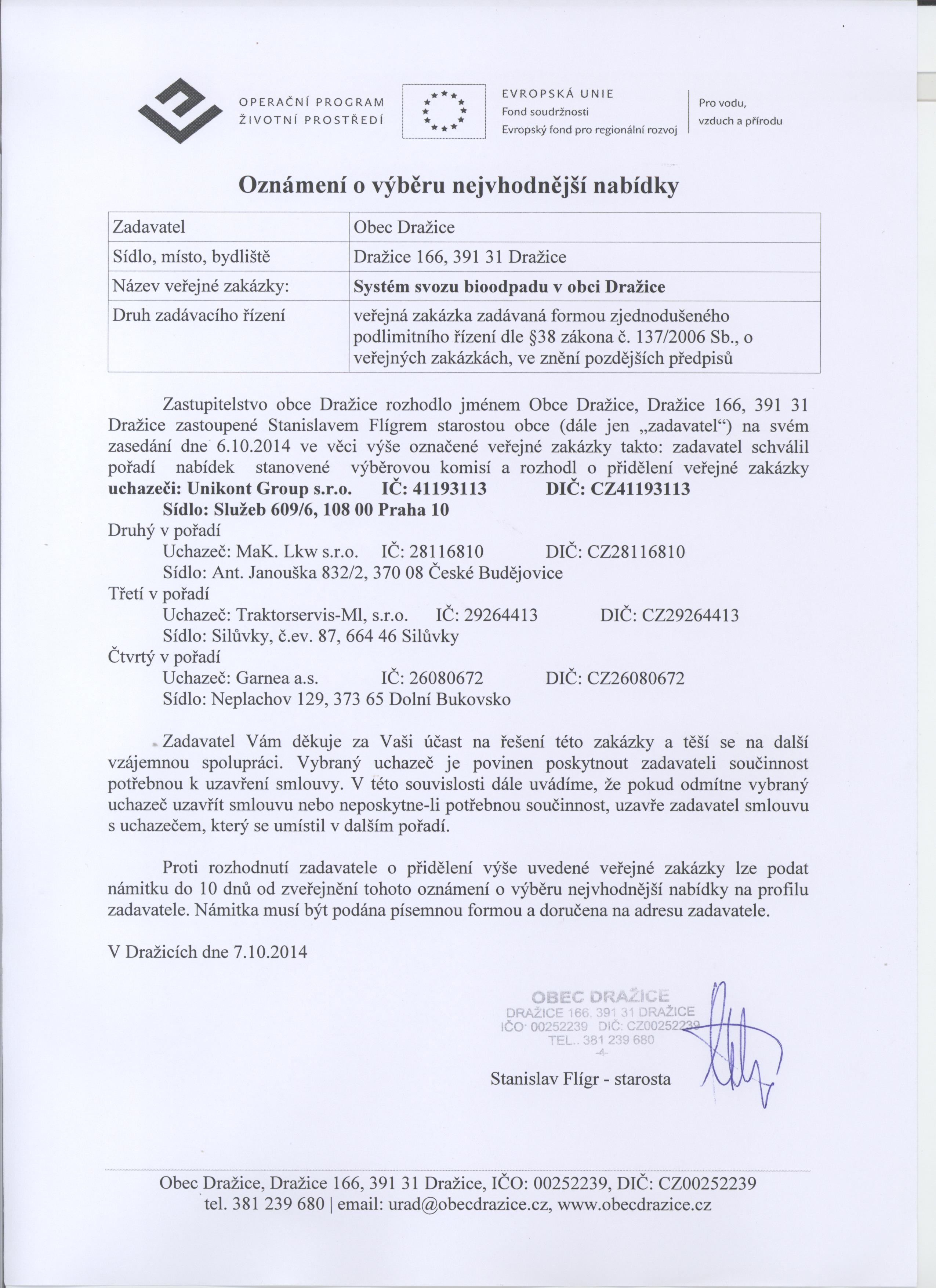 V příloze naleznete výběrové řízení na akci "Systém svozu bioodpadu v obci Dražice".