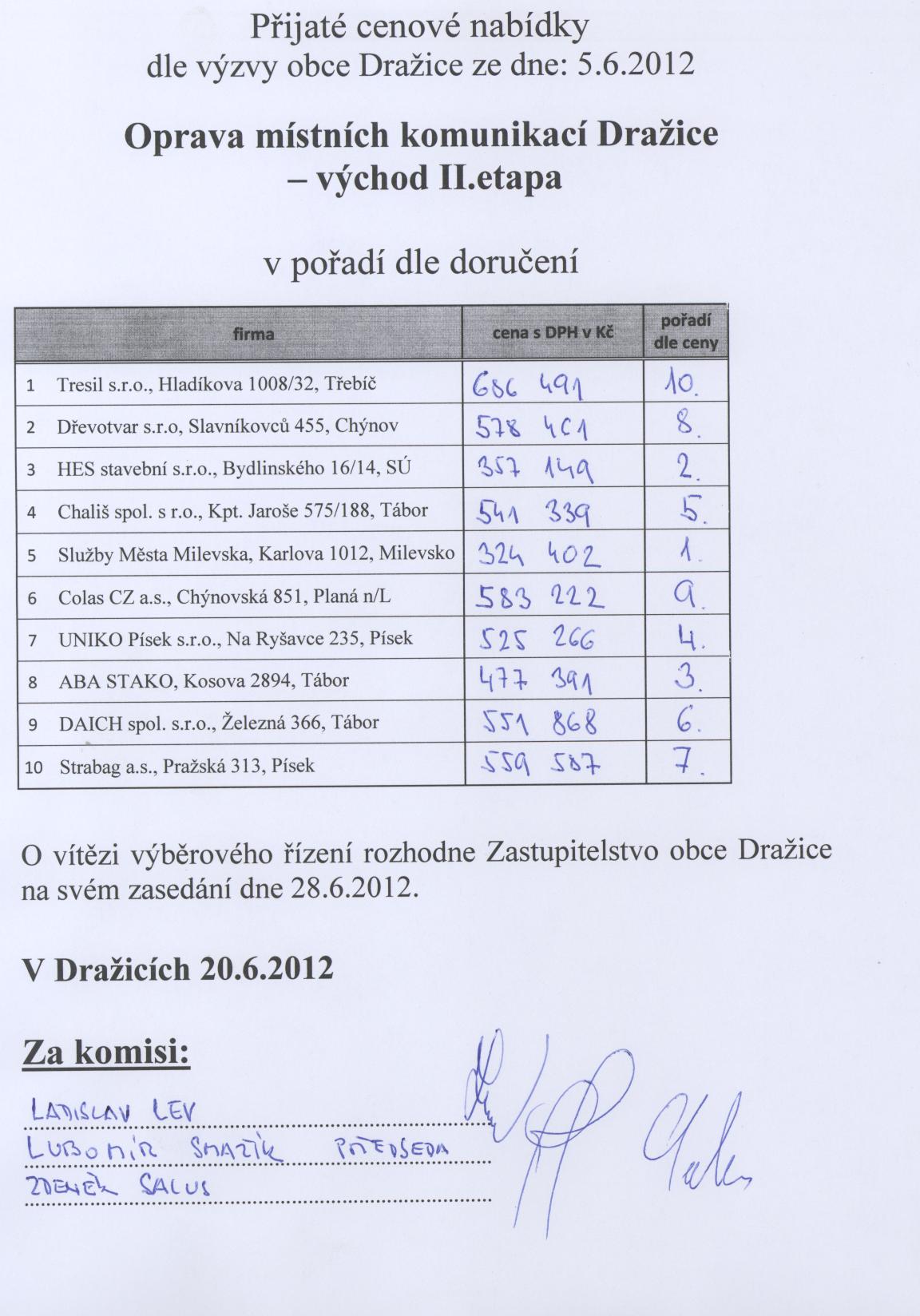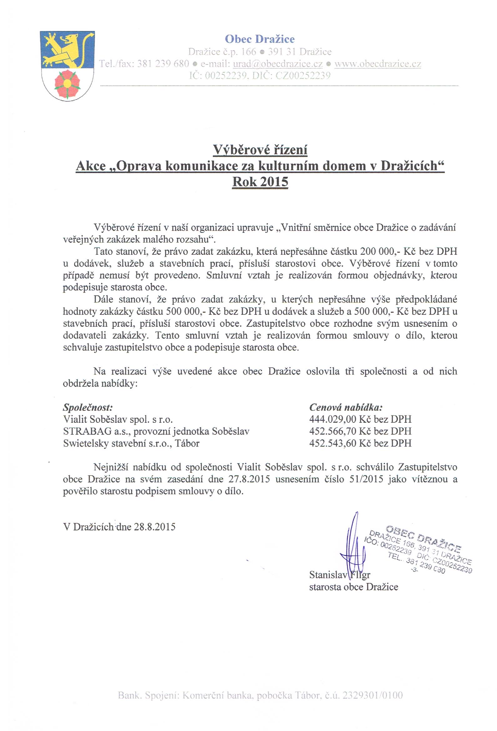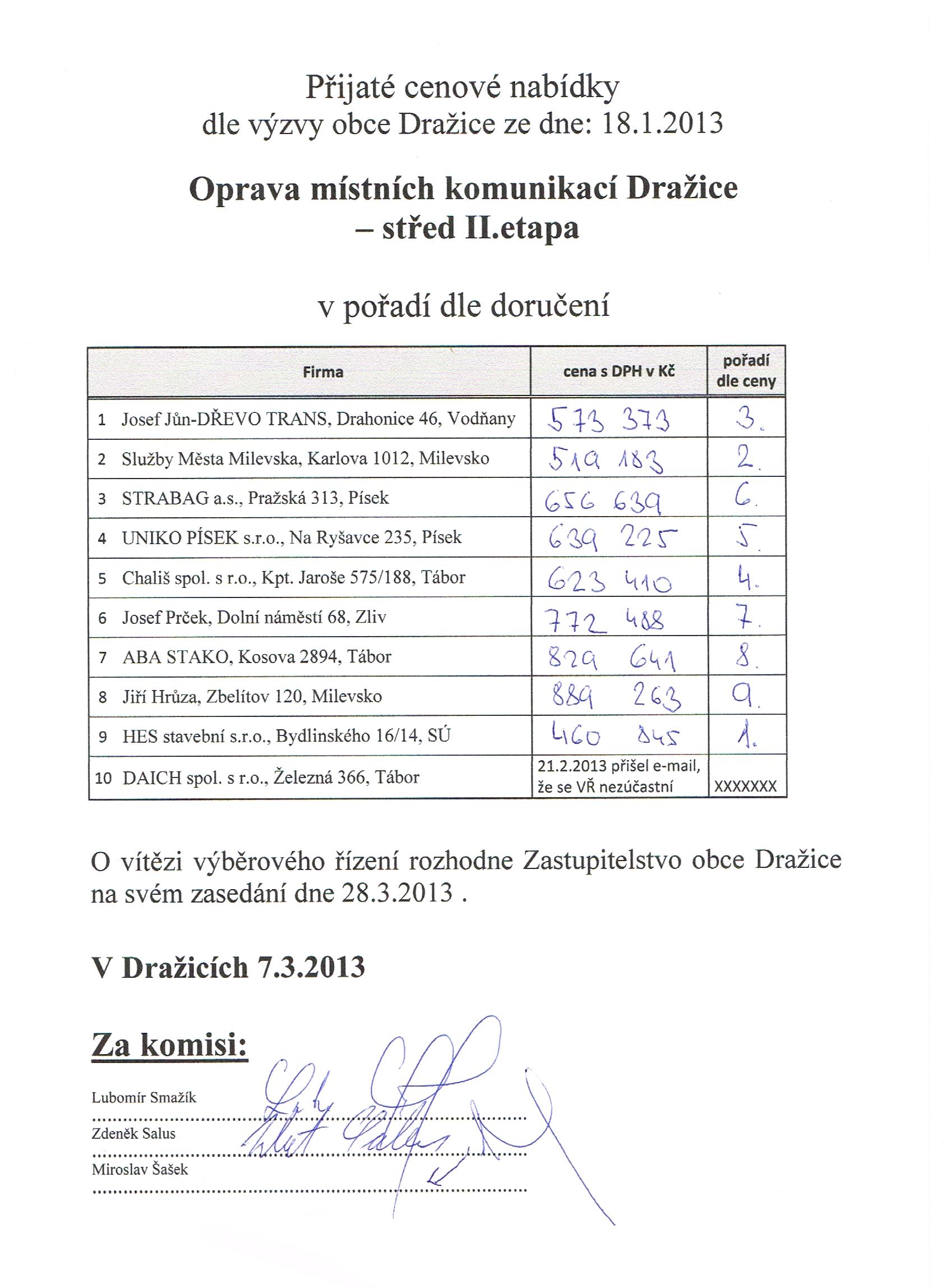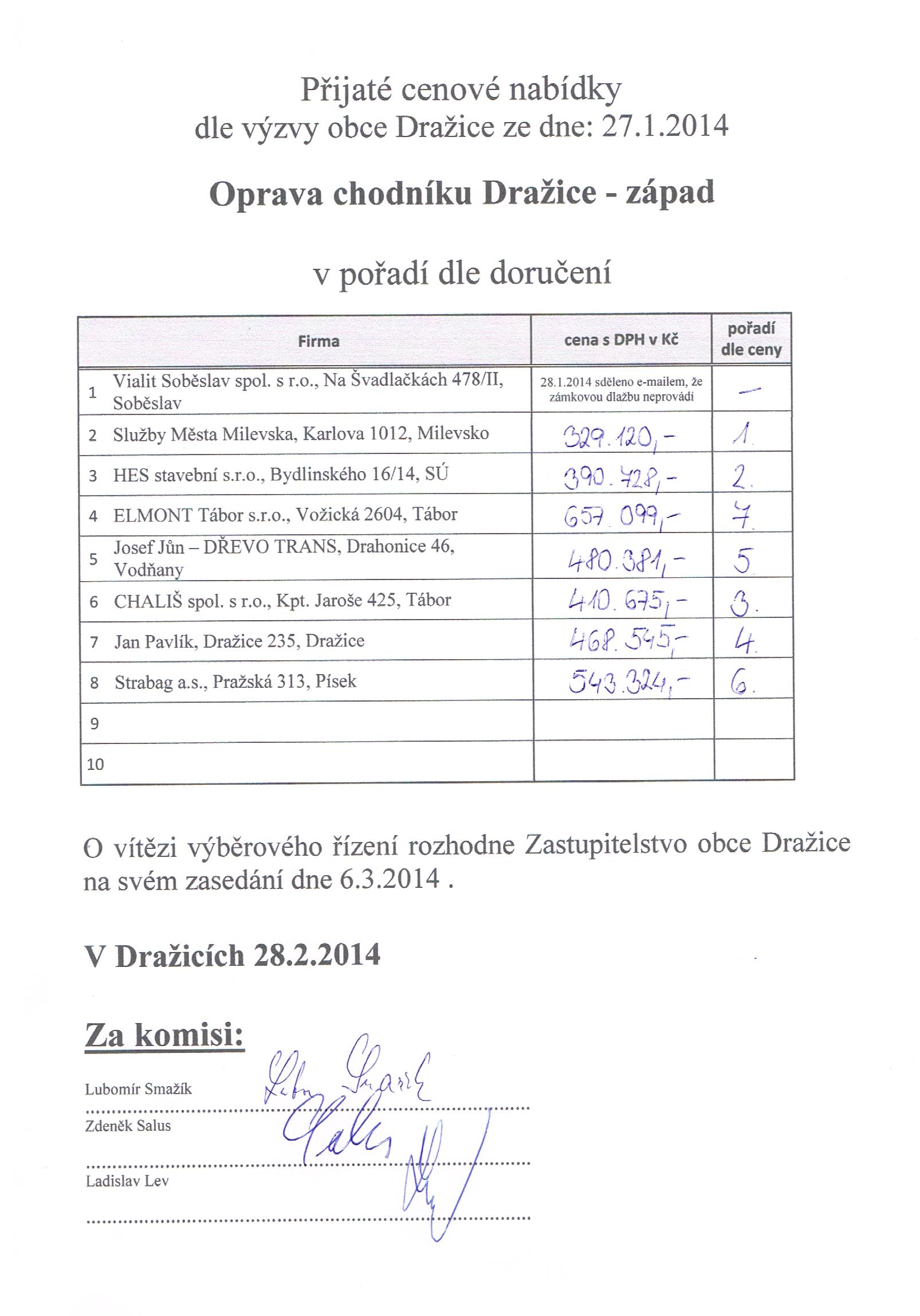 V příloze naleznete přijaté cenové nabídky a zápis z jednacího řízení na akci "Oprava chodníku Dražice - před kulturním domem", která se bude realizovat v létě 2016.