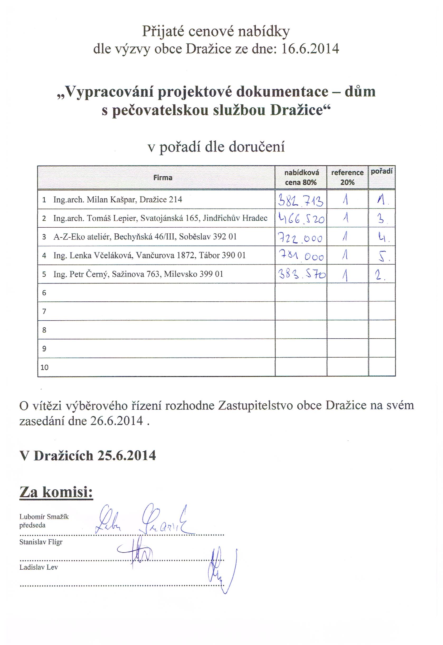 - výzvu k předložení nabídky na veřejnou zakázku malého rozsahu "Vypracování projektové dokumentace - dům s pečovatelskou službou Dražice". Nabídky lze podávat nejpozději do 25.6.2014 do 16:00 hodin.