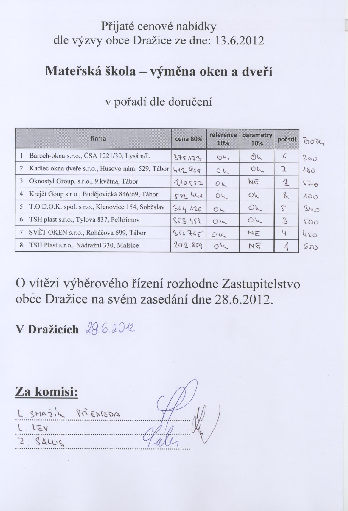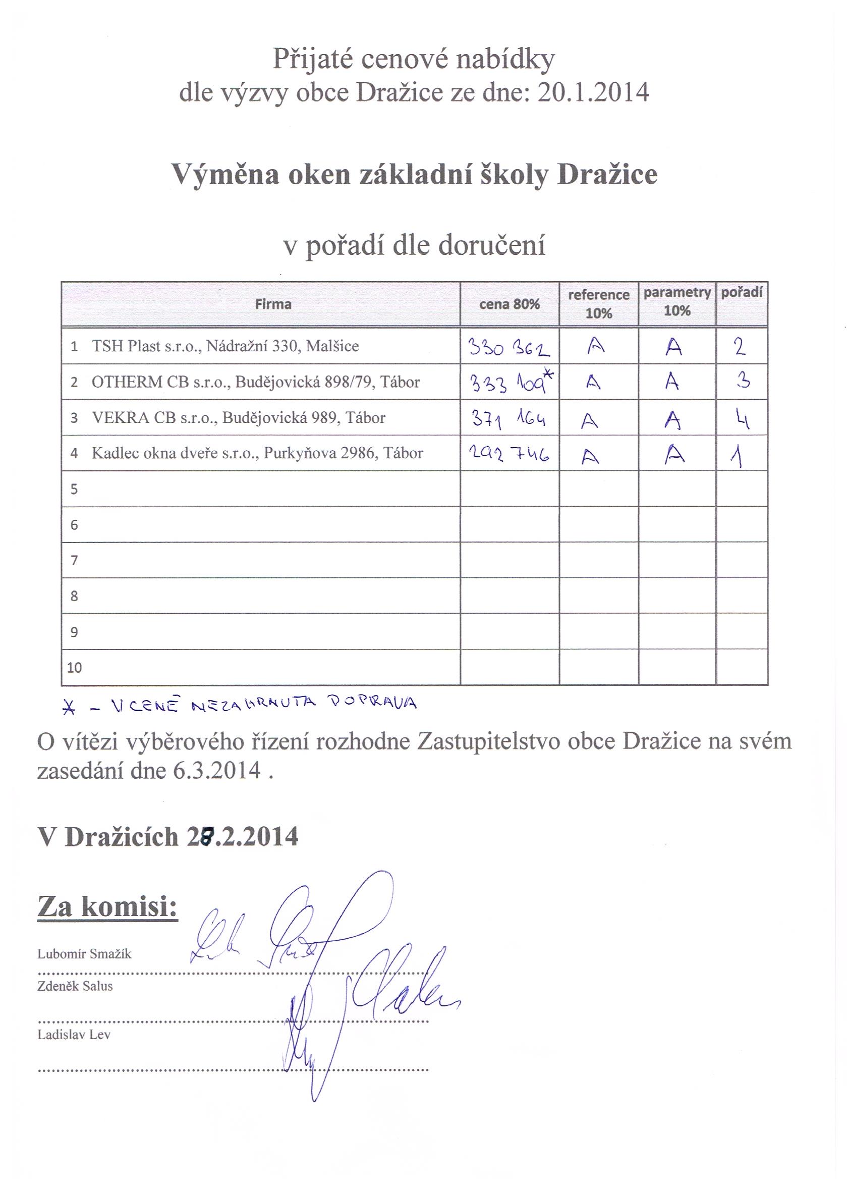 Výše uvedené výběrové řízení se uskutečnilo v souladu se směrnicí obce Dražice 2018/1 o zadávání veřejných zakázek malého rozsahu. V příloze naleznete zadávací dokumentaci, přijaté cenové nabídky a zápis.