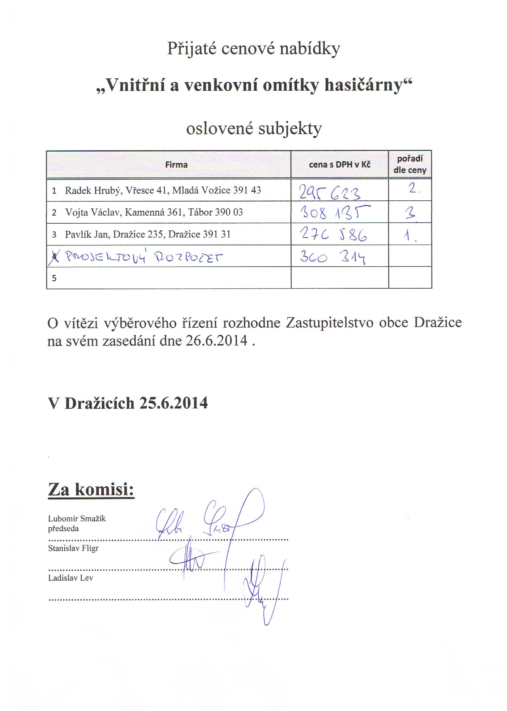 V příloze naleznete přijaté cenové nabídky a zápis z jednacího řízení na akci Vnitřní a venkovní omítky hasičárny