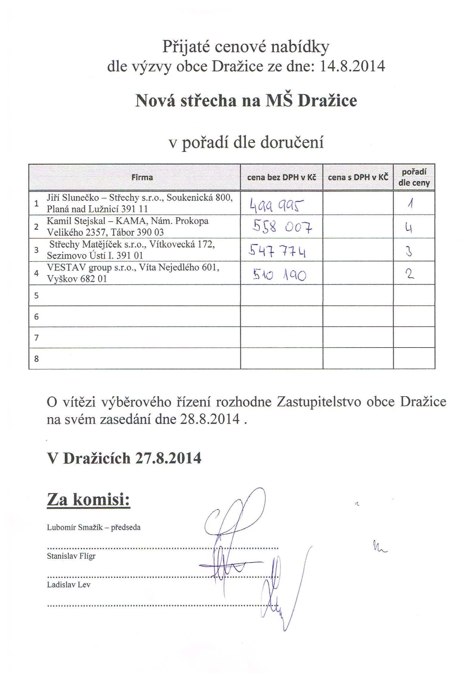 - výzvu k předložení nabídky na veřejnou zakázku malého rozsahu "Nová střecha na MŠ Dražice". Nabídky lze podávat nejpozději do 27.8.2014 do 12:00 hodin.