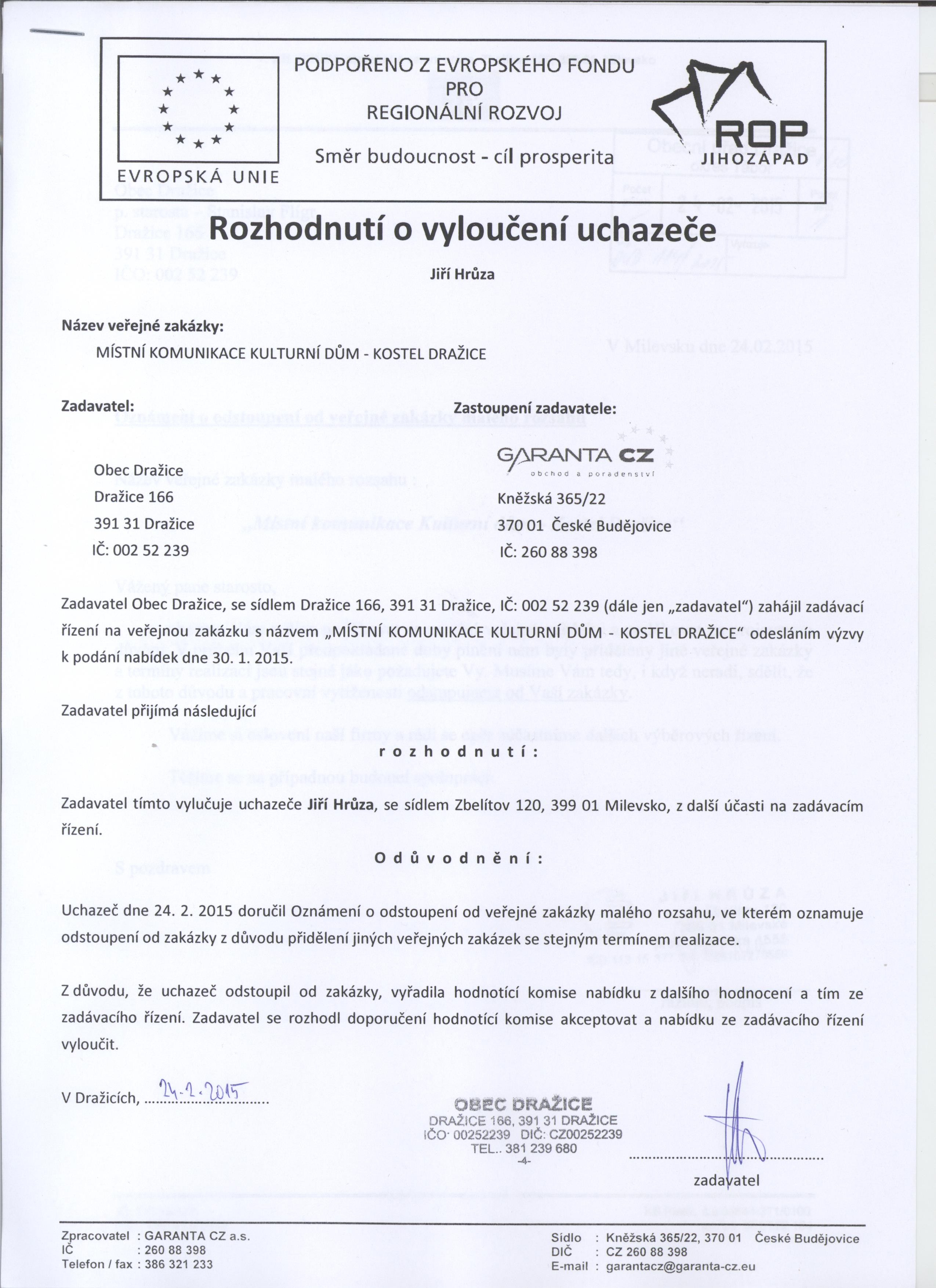 V příloze naleznete výsledky výběrového řízení na akci "Obnova hřbitovní zdi kolem kostela v Dražicích"