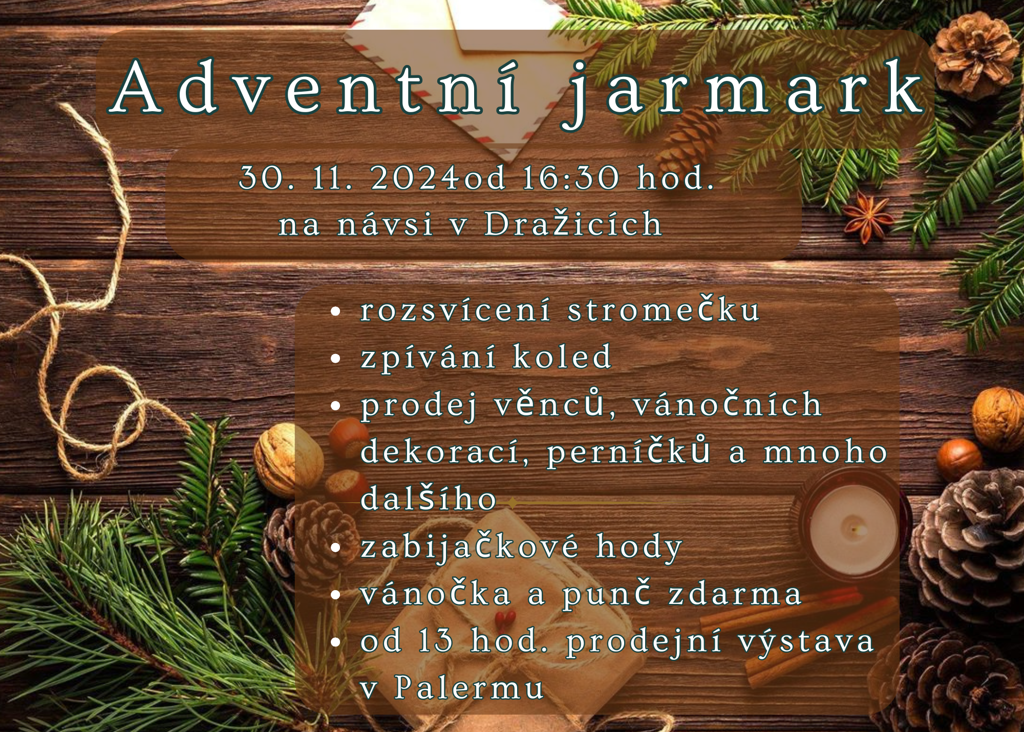 na návsi v Dražicích v sobotu 30.11.2024 od 16:30. Od 13:00 bude v Palermu KD Dražice prodejní výstava. Bližší informace naleznete v příloze.