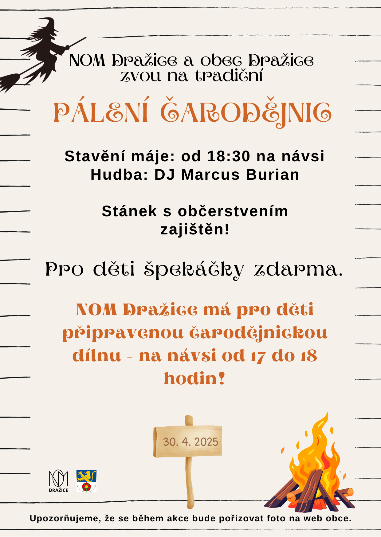 Dražice náves - 30.4.2025 od 18:30. Čarodějnická dílna pro děti od 17:00 do 18:00. Špekáčky pro děti zdarma. Hudba: DJ Marcus Burian.