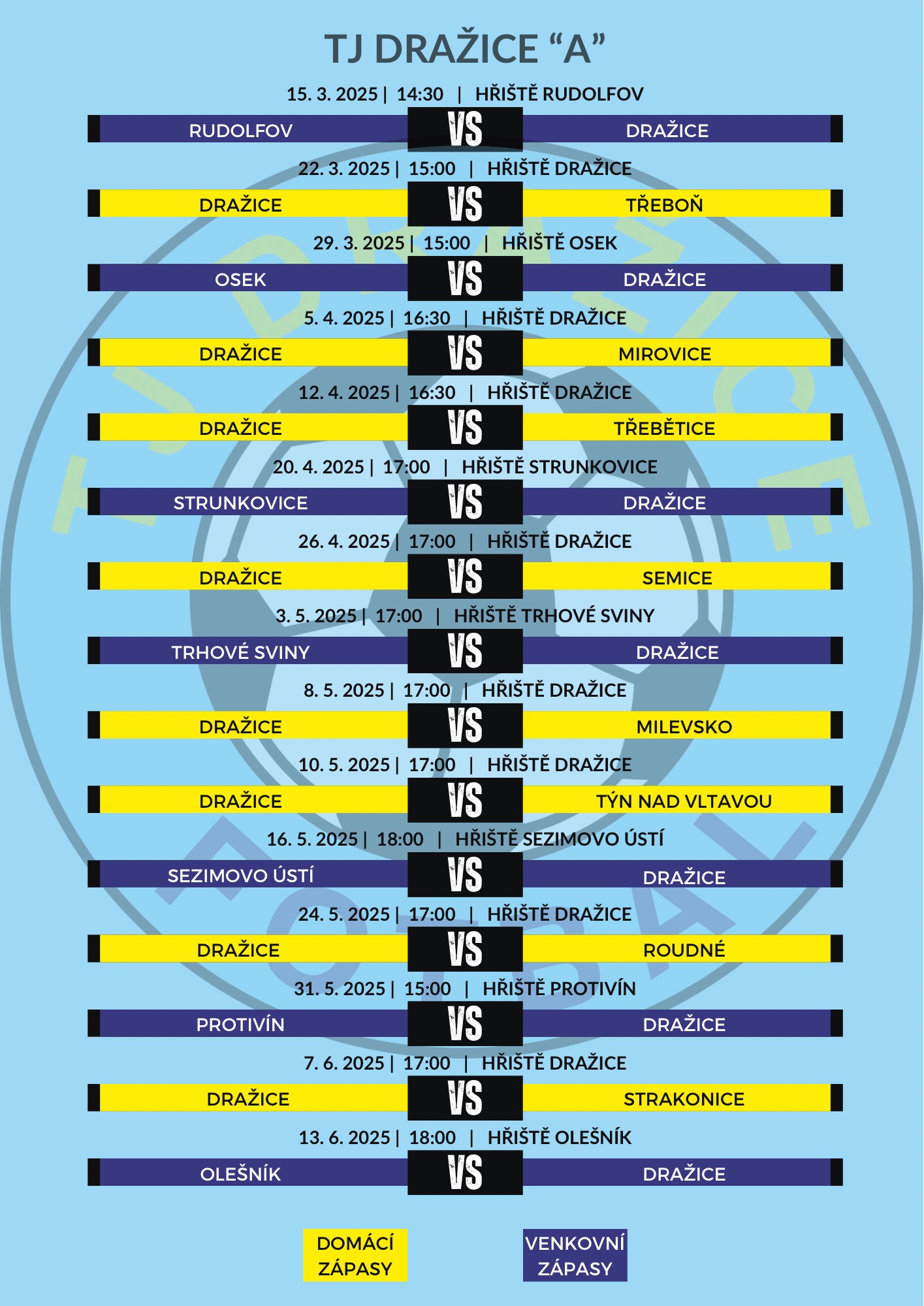 V příloze naleznete rozpis zápasů TJ Dražice muži "A" - jaro 2025.