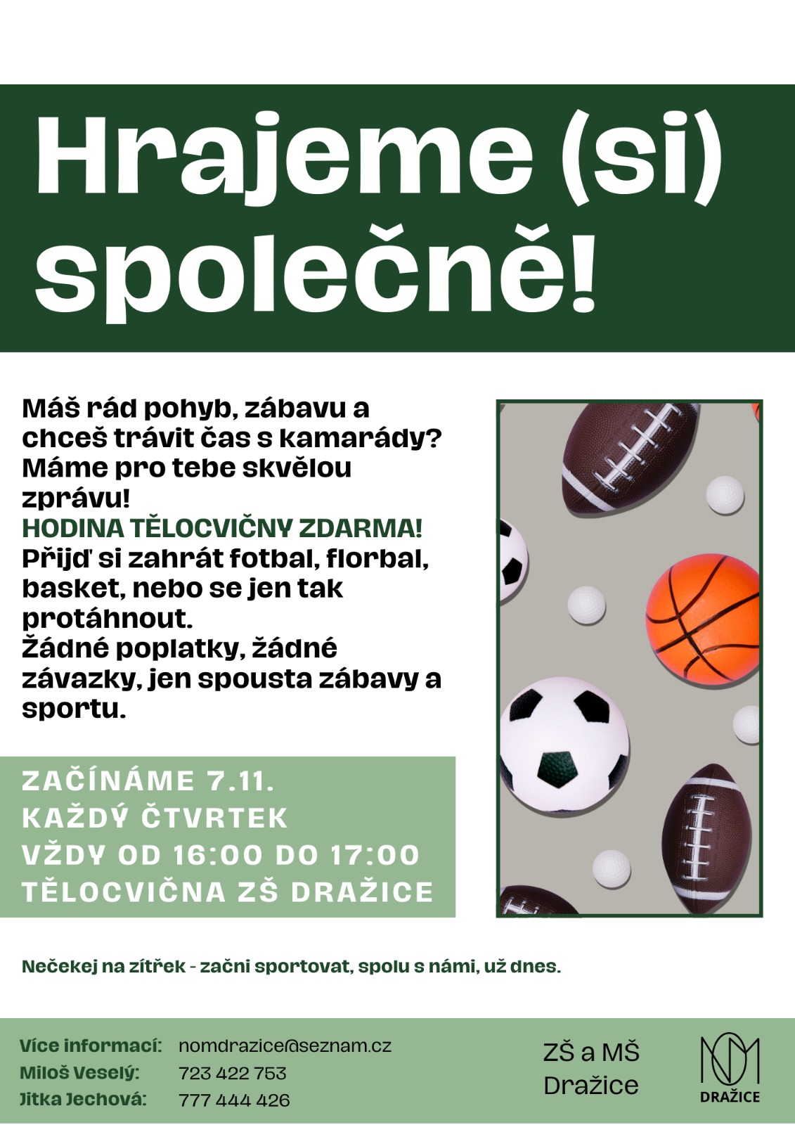 Pohybové aktivity, kolektivní hry, společné akce s rodiči pro děti od 4 do 6 let. Sportovní hala Dražice každé pondělí od 16:00 do 17:00. Bližší informace naleznete v příloze.