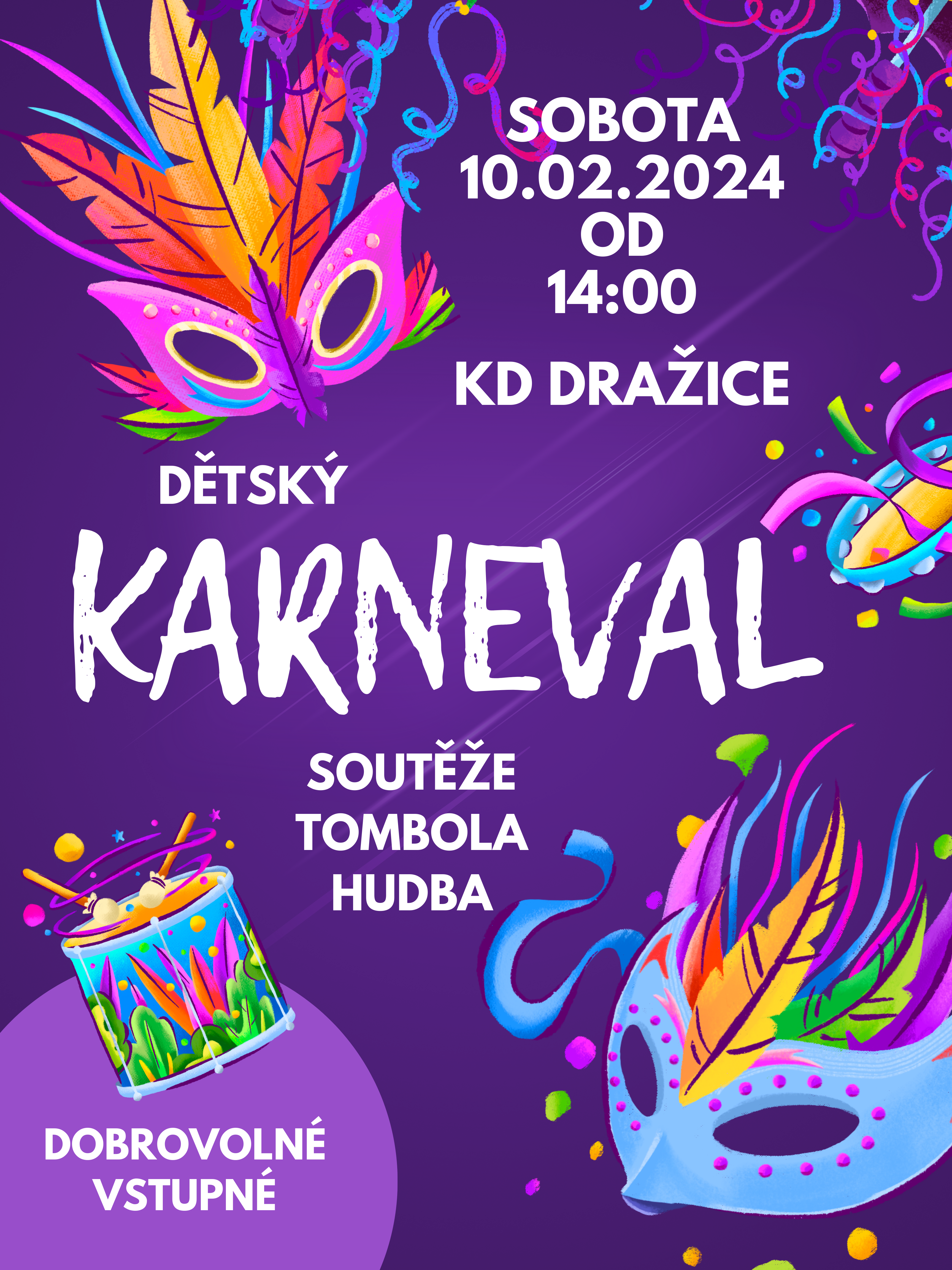 NOM Dražice zve všechny do masopustního průvodu, který se uskuteční 7.2.2026 od 10:00. Sraz masek je v 9:45 u hřiště.