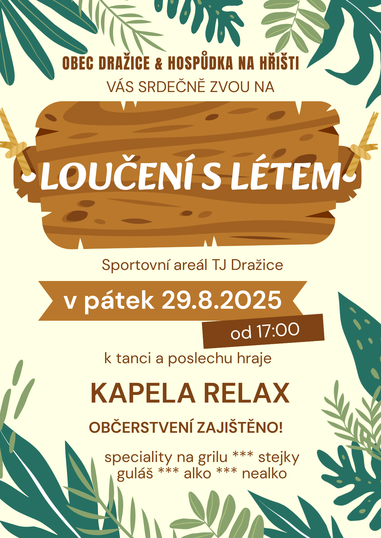 Sportovní areál TJ Dražice - pátek 29.8.2025 od 17:00. Bližší informace naleznete v příloze.