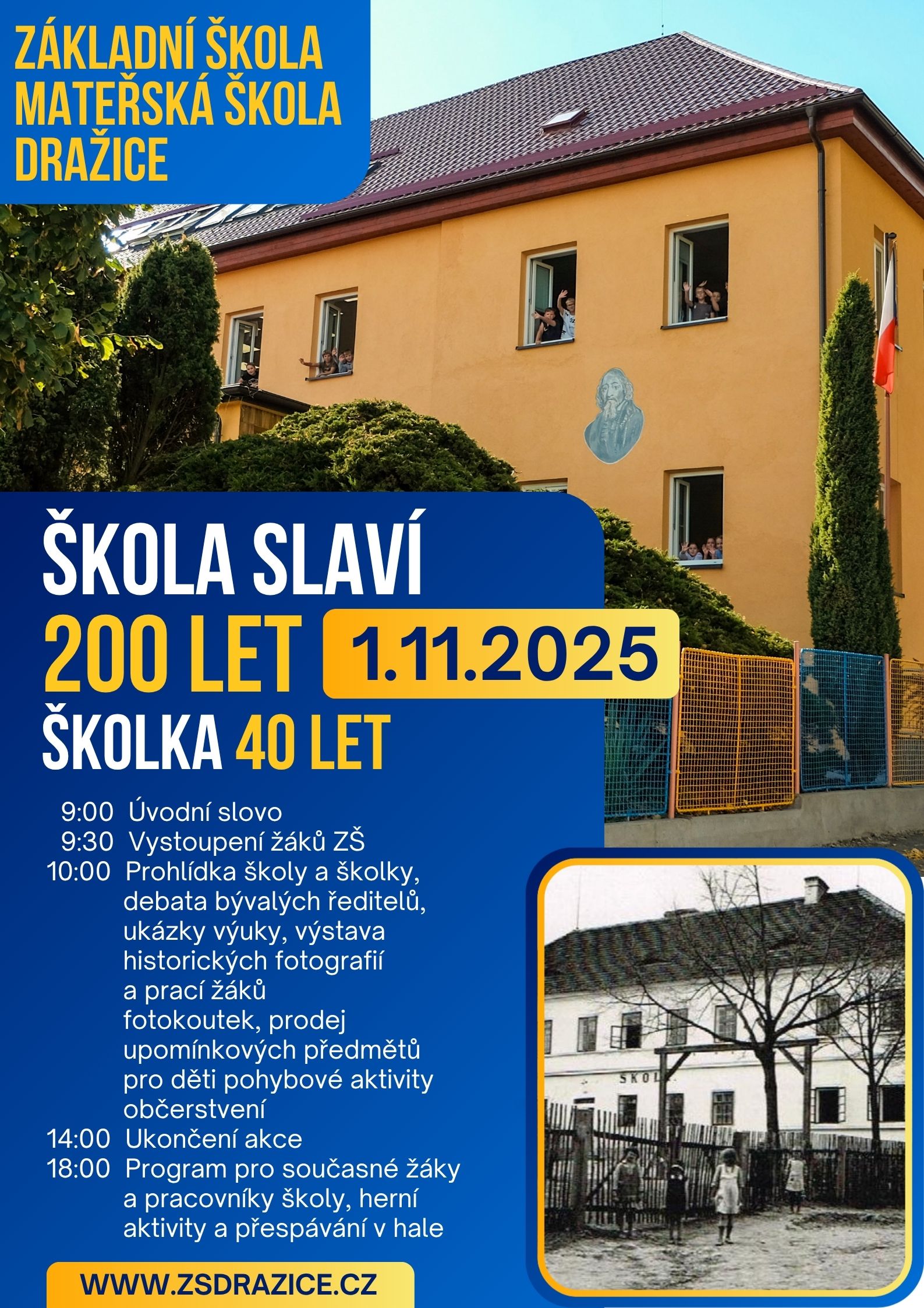 Oslavy výročí proběhnou ve školním areálu v sobotu 1.11.2025. Slavnostní zahájení bude v 9:00 ve sportovní hale. Více informací naleznete v příloze.