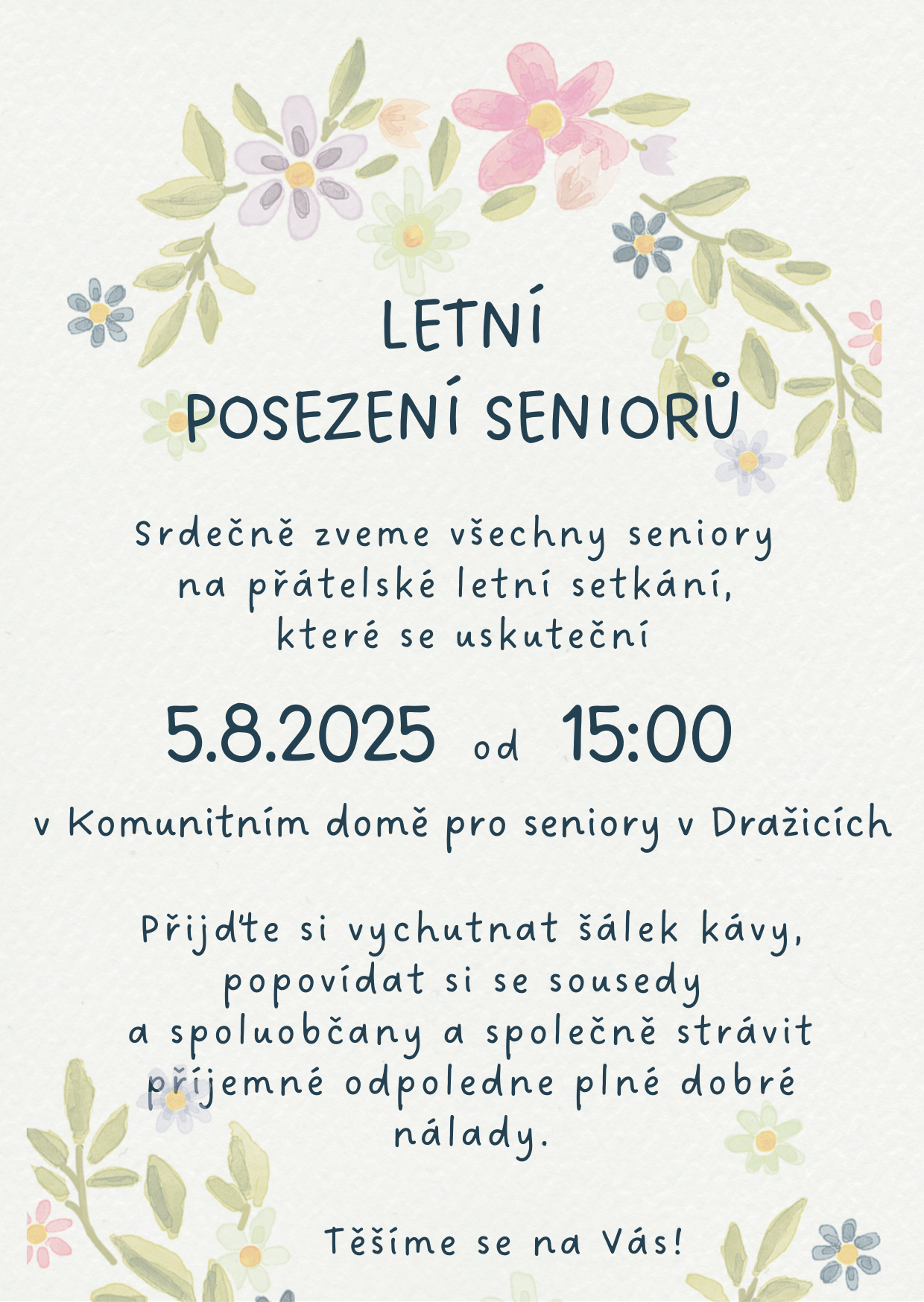 V úterý 5.8.2025 od 15:00 v Komunitním domě pro seniory v Dražicích. Bližší informace naleznete v příloze.