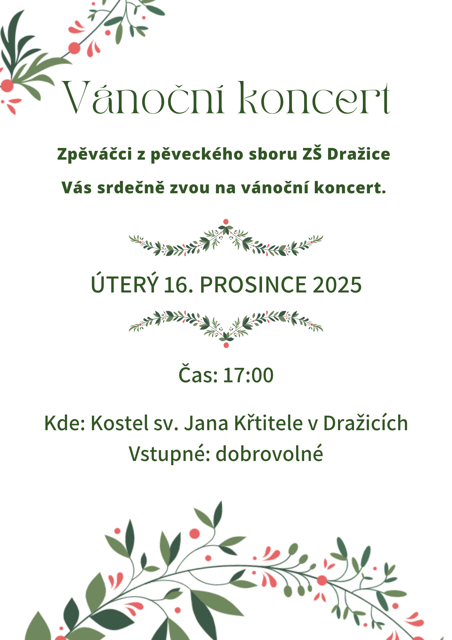 v úterý 16. prosince 2025 od 17:00 v kostele sv. Jana Křtitele v Dražicích. Bližší informace naleznete v příloze.
