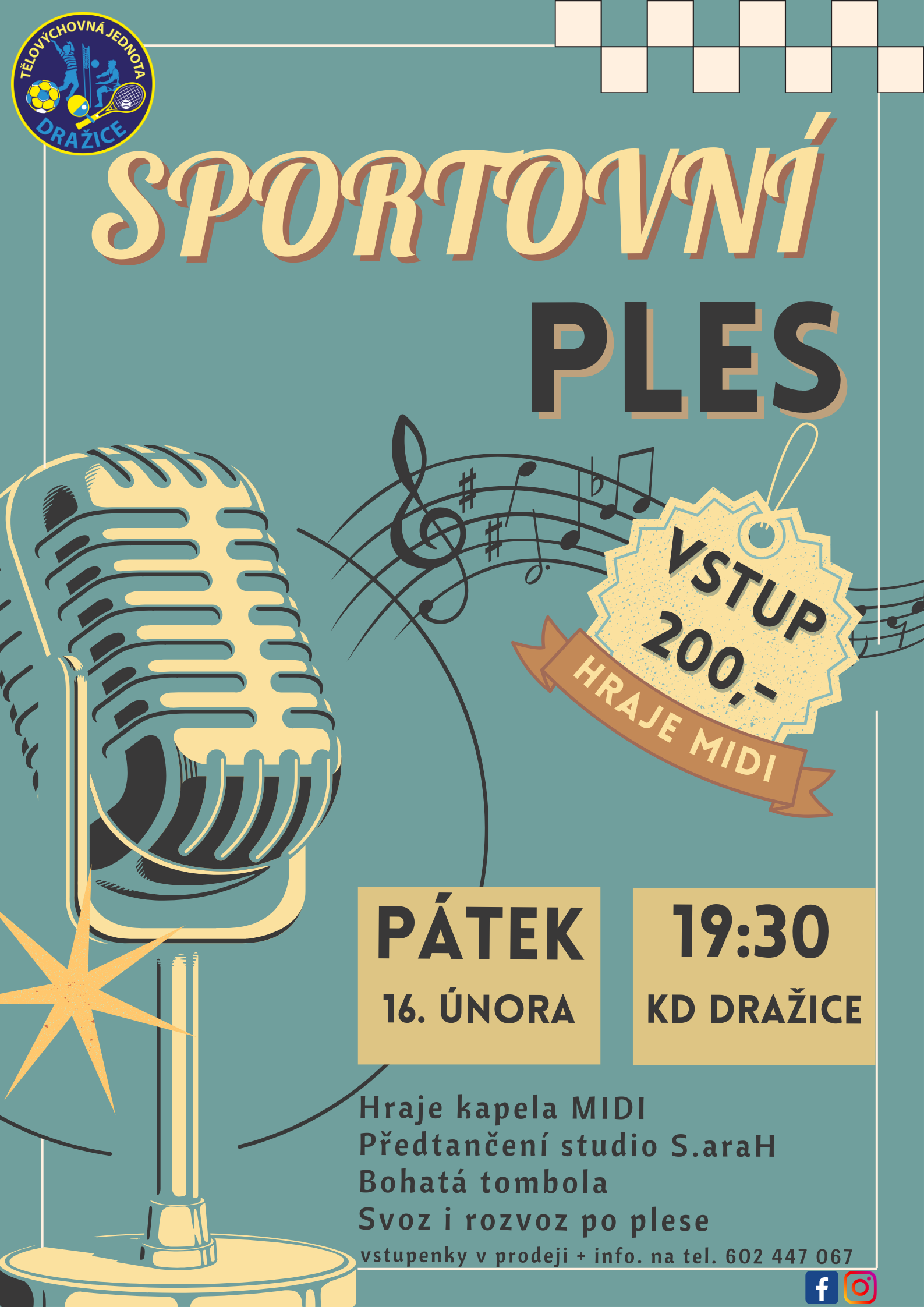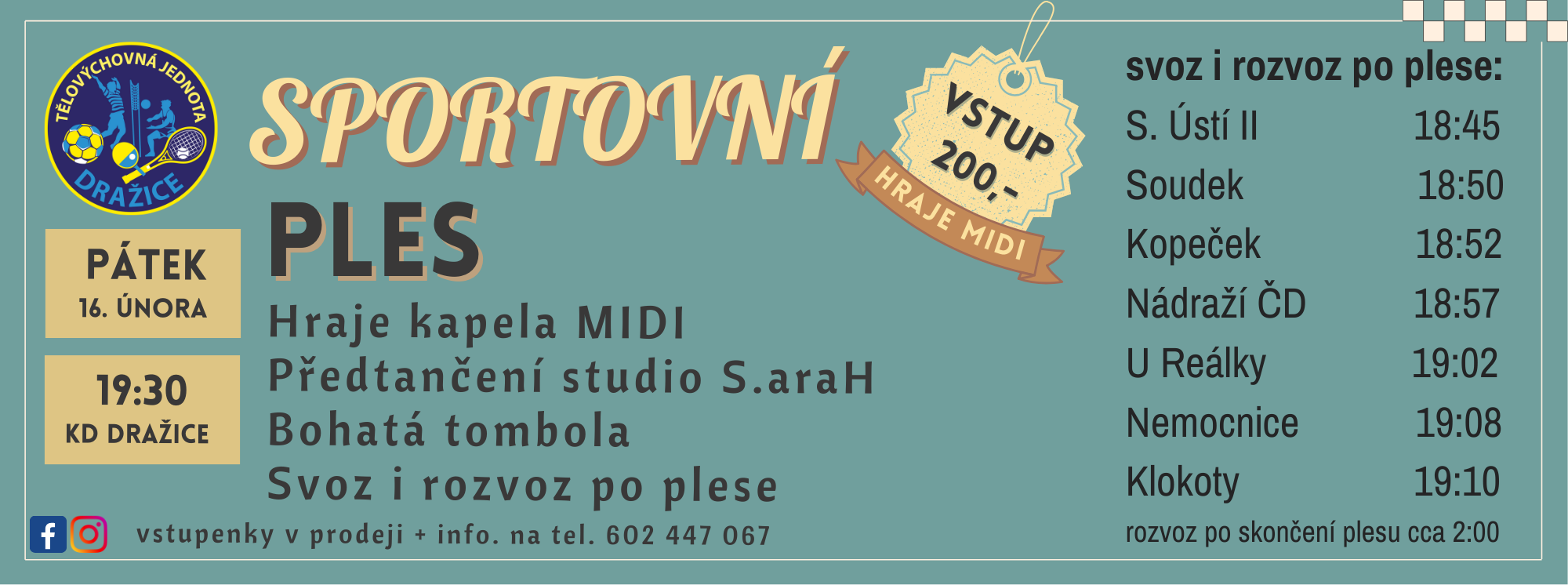 KD Dražice 23.1.2026 od 20:00. K tanci a poslechu hraje VOUZ BAND. Vstupné 199 Kč. Předprodej vstupenek je v úředních hodinách v kanceláři OÚ Dražice.