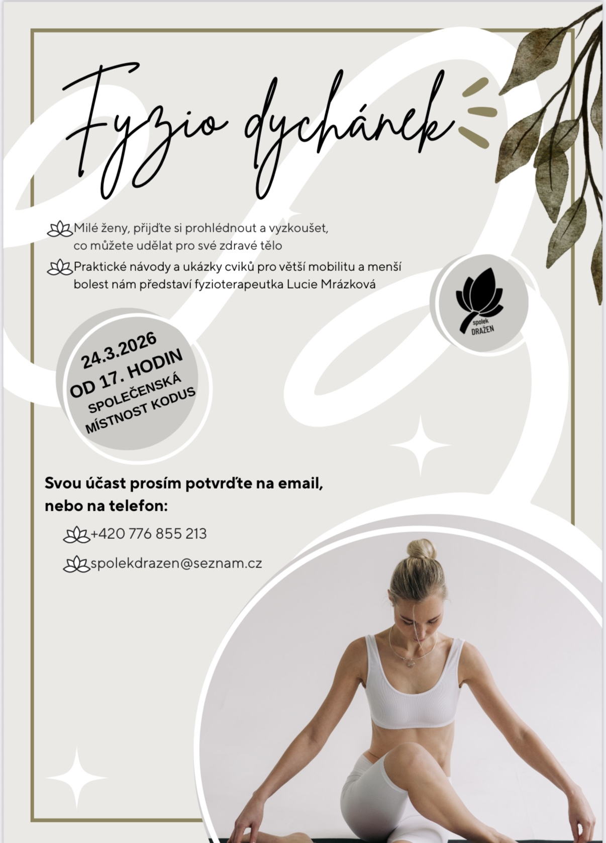 Společenská místnost KODUS Dražice 24.3.2026 od 17:00 - praktické návody a ukázky cviků pro větší mobilitu a menší bolest. Více informací v příloze.