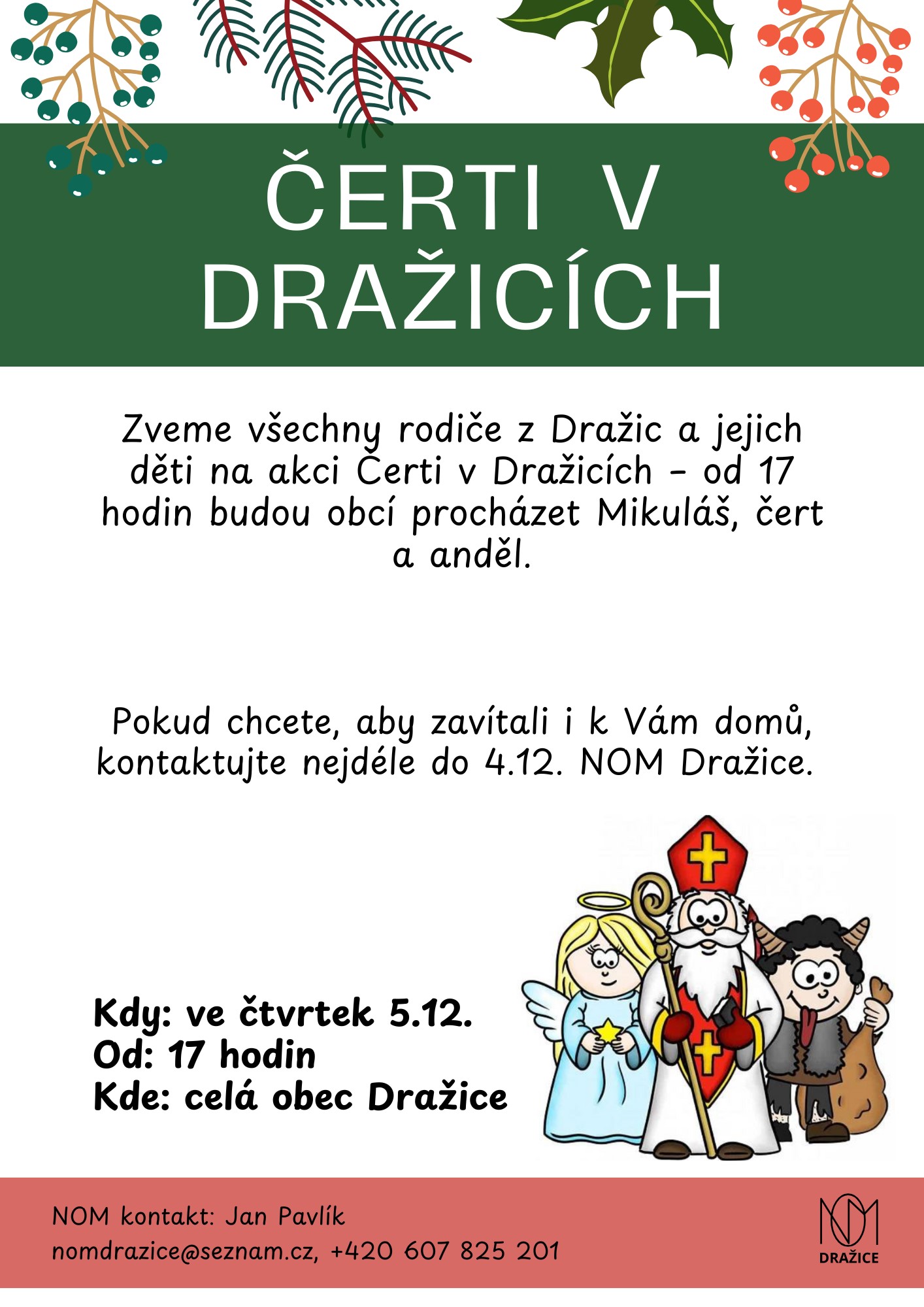 Ve čtvrtek 5.12.2024 budou od 17 hodin obcí procházet Mikuláš, čert a anděl. Pokud chcete, aby zavítali i k Vám domů, kontaktujte NOM Dražice.
