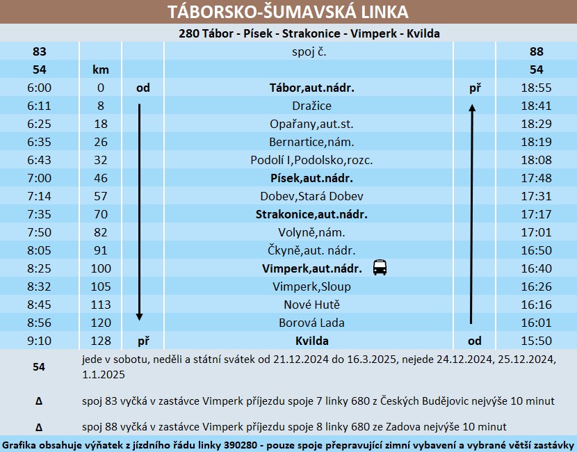 Spoje pro lyžaře (SKIBUSY) budou součástí autobusové linky 280 Tábor – Písek – Strakonice – Vimperk – Kvilda. Tyto spoje budou v provozu od 23. 12. 2024 do 16. 3. 2025. Linkou se cestující dostanou na Kvildu, případně mohou ve Vimperku přestoupit na linku 680 a dostanou se do lyžařského areálu Zadov.