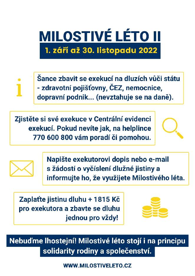 Akce probíhá od 1.9. do 30.11.2022. Pro dlužníky jde o druhou a zároveň poslední šanci, jak se výhodně zbavit exekucí. Bližší informace naleznete na níže uvedeném odkazu a v příloze.