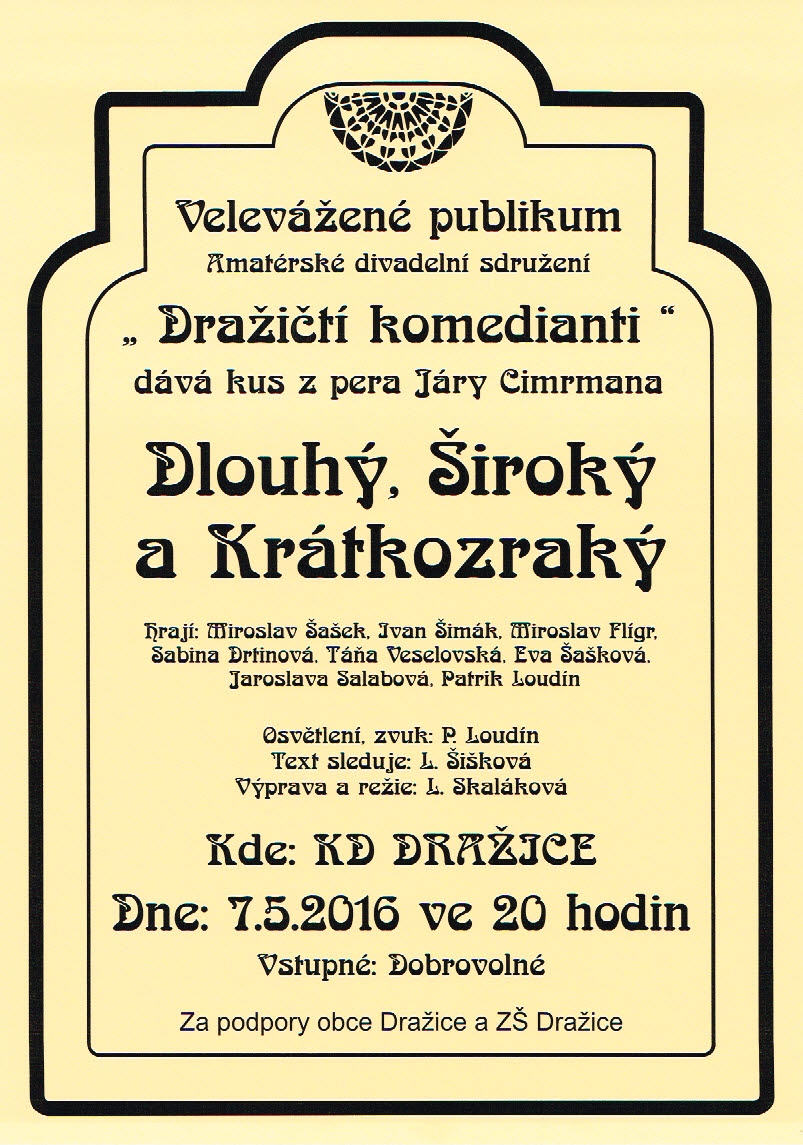 Dražičtí komedianti - KD Dražice 7.5.2016 ve 20 hodin - "Dlouhý, Široký a Krátkozraký". Více informací v příloze.